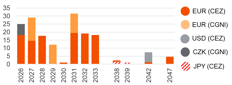 Časový profil splatnosti emitovaných dluhopisů Skupiny ČEZ* (31. 12. 2025)